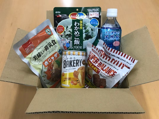 備蓄食料(パン・水・ごはん・クッキー・おかず)、 保存水