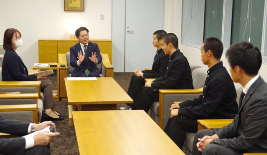 2024年10月5日に行われた『スポGOMI甲子園2024・岐阜県大会』で優勝した岐阜県立岐阜高等学校(岐阜県岐阜市)在校生3人組の「岐阜高校硬式野球部ドラえもん」が、大会での成果を報告するため岐阜県岐阜市長を表敬訪問しました。