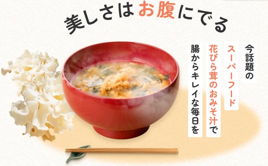 花びら茸はおいしくて栄養価も高く、加えてヘルシー。ですが、流通量が少なく価格も高く、手軽にお買い求めできない、希少なきのこでした。まだ身近な食材ではない花びら茸を“もっといろんな人に知ってもらいたい”、“健康と美容のために毎日手軽に食べてもらいたい”という想いで、このおみそ汁は誕生しました。お味噌は長野県の信州味噌、具材は規格外の野菜やキノコを使用したサステナブルなおみそ汁です。きのこで育菌、育菌で元気、キレイ。