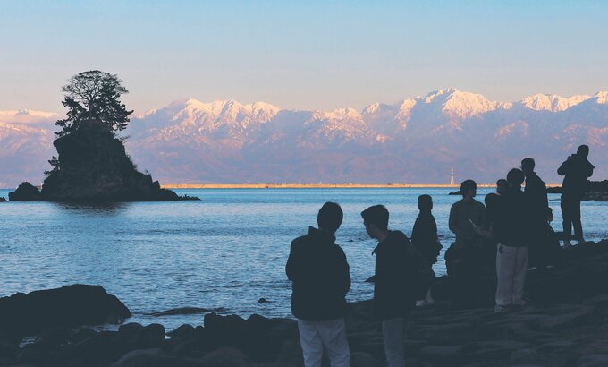2日の富山県内は高気圧に覆われて晴れ、富山地方気象台によると、最高気温は富山18.1度、高岡(伏木)17.7度など各地で11月上旬から中旬並みの暖かさとなった。高岡市の雨晴海岸では、海越しに立山連峰がくっきりと見えた。日没前の午後4時ごろから夕日を受けた峰々がオレンジ色に染まり始め、多くの人が絶景に見入った。