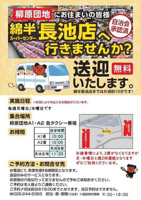 綿半ホームエイド(本社:長野県長野市 代表取締役社長 牧島禎彦)は、綿半スーパーセンター長池店にて無料送迎を開始し今年で実施2周年を迎えました。
