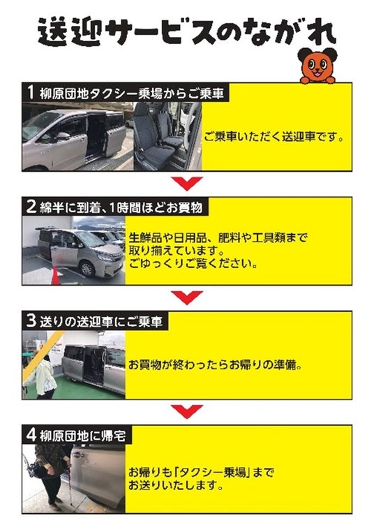 現在、主に集合住宅(団地)を対象として送迎しており、初期は柳原団地1カ所でしたが、大豆島東区、大豆島上区(老人憩の家)も加わり3カ所へ拡大しています!