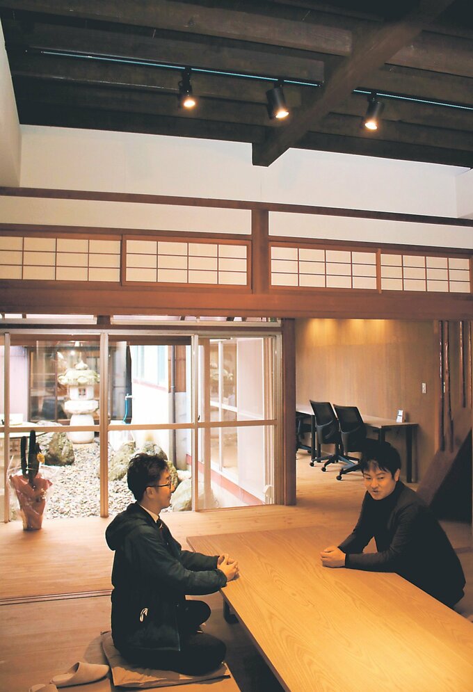 建築設計を担った法澤建築デザイン事務所(滑川市)の法澤龍宝代表取締役(41)によると、建物の内装は極力シンプルにして、町屋らしさを残したという。入り口からすぐの客室は、元々あった天井を剥がし、建物の骨組みを見せて開放感を強調。中庭もある。