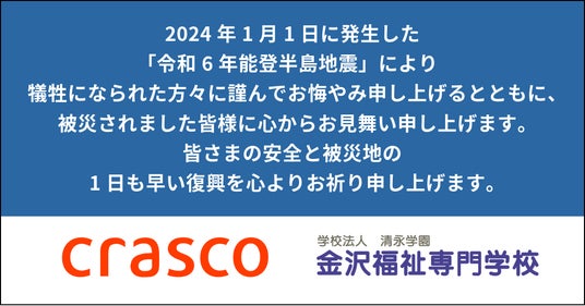石川県金沢市にて専門学校を運営する、学校法人清永学園(所在:石川県金沢市 理事長:青木陽一良 学校名:金沢福祉専門学校)と石川県を中心に不動産事業を行う、株式会社クラスコ(本社:石川県金沢市/代表取締役社長:小村典弘 以下、クラスコ)は、クラスコが実施している2024年1月1日に発生した「令和6年能登半島地震」を受け、被災者の皆さまへの住宅支援における業務提携を締結しました。(締結日:2024年12月6日)