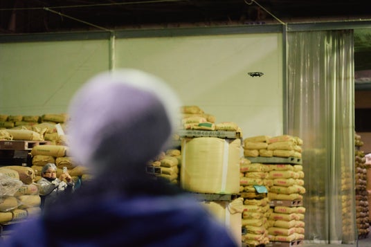 ・今回の実験は、「検知・測定・牽制」のうちの「牽制」パートを中心に行いました。事前に飛行テストの屋内現場を3Dマップ化し、人を仮想鳥獣と見立て、AIが検出して自動でドローンが飛行。ドローンがダミー障害物(画像1参照)の脇をすり抜けるような最適飛行経路を生成。