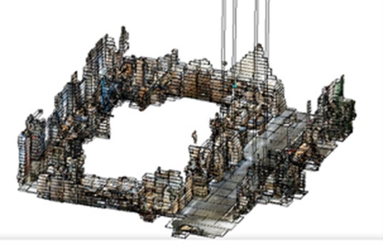 (画像1)飛行テストをする屋内現場を3Dマップ化。写真上部に伸びる4本線が仮想障害物。