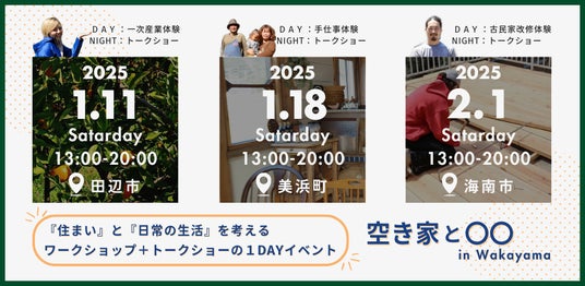 Kii-Labでは、和歌山で空き家を買い、やりたいことを実現する。空き家を生かした暮らしを実感してもらうための、ワークショップ+トークショーの1DAYイベントを2025年1月11日、1月18日、2月1日に実施いたします。