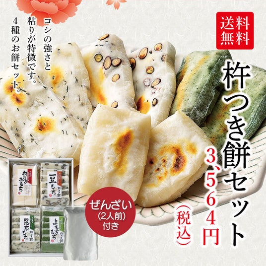 ささら屋の冬ギフト人気No.1の「みずほの彩(月)」や、今年はささら屋のあのぜんざいも入った4種類の餅がセットになった「杵つき餅セット」も送料サービス(当社送料負担)でお届けできます。