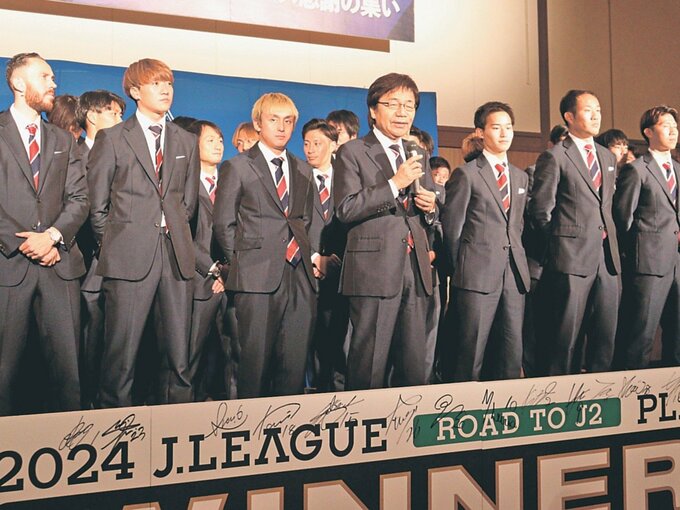 最後に小田切監督が「J2復帰を決め、皆さんに笑顔で感謝の言葉を伝えられたことにほっとしている」と述べ「来季も厳しい戦いが続くので、皆さんの応援が支えになる」と話した。