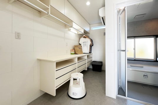洗面ルームには広いサニタリースペースが設けられ、家事が効率的に行えるよう設計されています。