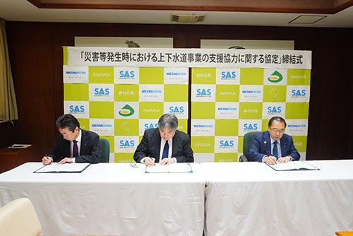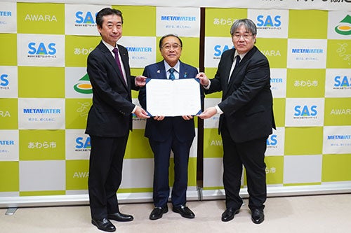 メタウォーター株式会社(社長:山口 賢二、本社:東京都千代田区)を代表とする企業グループ「メタウォーター、水道アセットサービス共同企業体」(以下「当グループ」は、2024年12月6日、福井県あわら市(市長:森 之嗣)と「災害等発生時における上下水道事業の支援協力に関する協定」(以下「本協定」)を締結しました。6日に行われたあわら市役所での協定締結式には、森市長、当社執行役員 営業本部長の児島 賢治、水道アセットサービス株式会社の土屋剛 代表取締役社長らが参加しました。