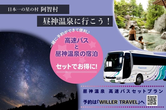 移動と分野の垣根を超えたCROSS(融合)から生まれる新たな価値を創造するWILLER ACROSS株式会社(本社:東京都中央区、代表取締役社長:宿谷勝士、以下「WILLER ACROSS」)は、日本一の星空「長野県阿智村」の発展を観光振興の側面で支える株式会社阿智昼神観光局(本社:長野県下伊那郡阿智村、代表取締役社長:白澤裕次、以下「阿智昼神観光局」)と連携し、昼神温泉の宿泊と高速バスがセットになった「昼神温泉 高速バスセットプラン」(以下「本プラン」)の販売を、予約サイト「WILLER TRAVEL」(以下「WILLERサイト」、URL:https://travel.willer.co.jp/tour/campaign/hotsprings/hirugami/)にて本日12月11日(水)より開始します。
