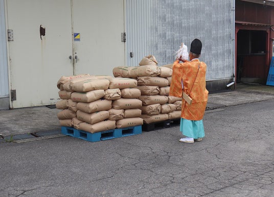 収穫した「新大正もち」を日の出屋製菓産業の地元である南砺市福光地区の「福光宇佐八幡宮」に、無病息災・開運招福を2024年11月21日に祈祷していただきました。祈祷した縁起の良いお餅で、新しい年を祝っていただきたいという願いが込められています。