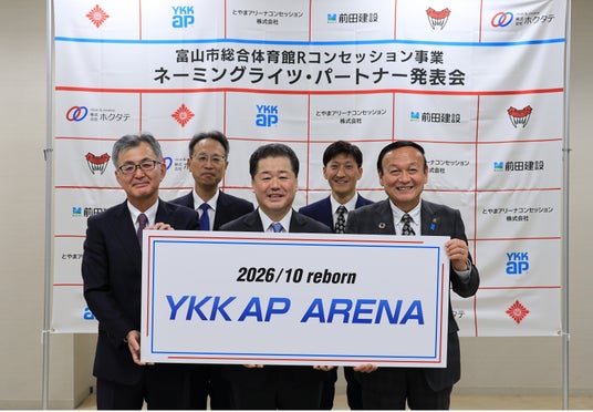 YKK AP株式会社(本社:東京都千代田区、社長:魚津 彰)は、富山市総合体育館Rコンセッション事業(※1)を運営するとやまアリーナコンセッション株式会社(※2)と富山市総合体育館のネーミングライツ・パートナー基本協定を締結しました。12月11日、富山市総合体育館で同施設のネーミングライツ・パートナー発表会を開催し、新名称を「YKK AP ARENA(アリーナ)」と発表しましたのでお知らせします。契約期間は2026年10月1日から5年間の予定です。