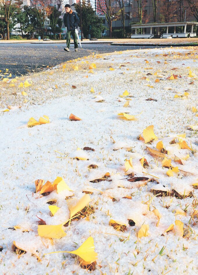 同市新総曲輪の県庁前公園では、早朝に降った雪が芝生の上にうっすらと積もった。日中の最高気温は富山7・9度、高岡(伏木)7・5度だった。