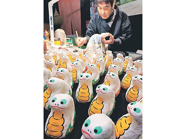 和紙を加工した際に出る端切れなどで型を作り、和紙を貼って絵付けする。今年は白蛇の体の側面が緑と朱赤色の2種類を販売する。伝統工芸士の前崎真也さんは「かわいく美しく、華やかに仕上げた。来年はいい年になってほしい」と話した。