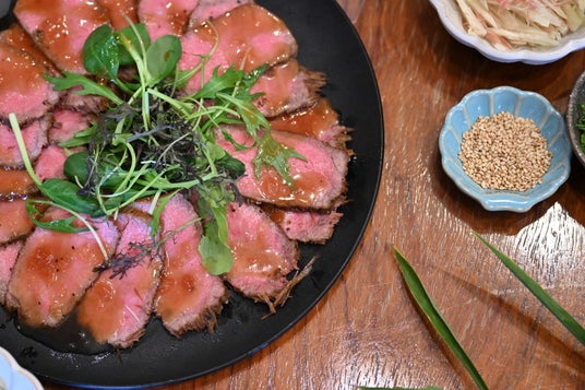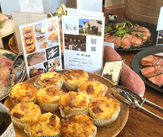 のびのび育った福地鶏の卵とハム、そして、北潟地区の北に位置する「富津 」地区で栽培されている福井を代表するサツマイモ「とみつ金時 」を入れてキッシュにしました。エッグタルトにはホイップをのせて。自社牧場で育てられた若狭牛のローストビーフは、2023年ESSE ふるさとグランプリにて金賞を獲得されました。