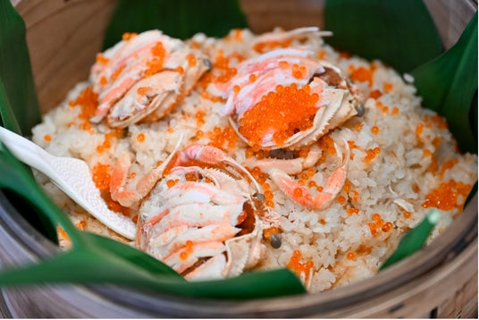 メニューでは、ふくいサーモンといくらに旬の野菜を合わせ、今しかとれない「せいこ蟹」は、特別栽培米のコシヒカリを使用した炊き込みご飯にしました。旬の寒ブナは、大正元年から本格的な醤油づくりを始めた醤油店のお醤油と大根おろしなどで味わいます。