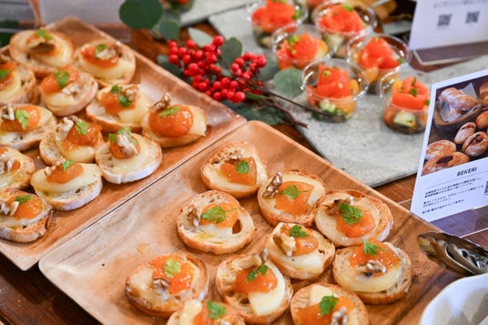 カナッペには、特産「越前柿 」を使用したあんぽ柿と、市内にある牧場の新鮮な生乳で作られた手作りナチュラルチーズをのせました。バケットは、指中地区にオープンするパン屋さんで作っていただきました。