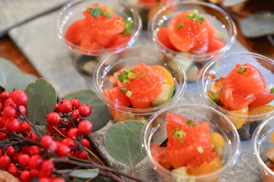 水にこだわり、在来種のそば粉を使用したお蕎麦をサラダに。お蕎麦の上には、福井県内でもナンバー1の栽培面積を誇るれんこん農家のれんこんチップスを添え、極上の甘みのあるトマト「越のルビー」のドレッシングをかけました。脂の乗った焼き鯖寿司と、柿の葉の香りとこだわりの素材を楽しめる柿の葉すしをご用意しました。
