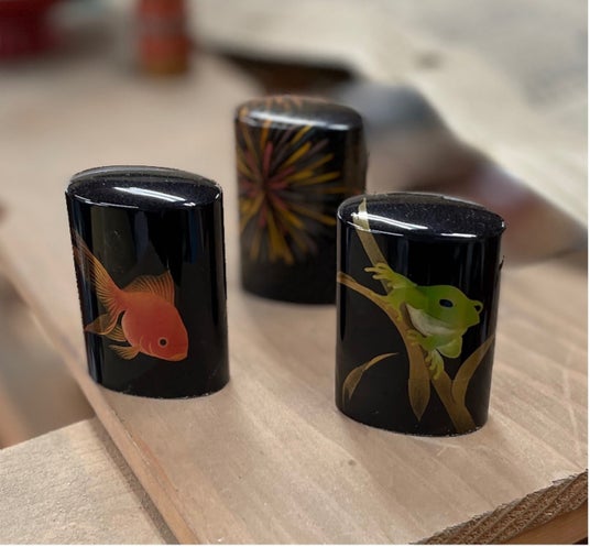 布と漆を25層貼り合わせた印籠造りで素地が造られています。印籠は元々印判を入れる箱として造られましたが、室町時代頃から練り薬をいれて持ち歩く箱として使われるようになりました。この懐中小物入れは常備薬などをいれてポケットやバッグに入れて持ち歩くように造られています。合口がどこにあるのかがわからないほど高度な合口蒔絵にて金魚、蛙、花火が描かれています。