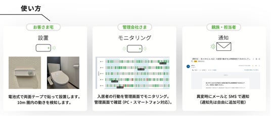 「みまもりヤモリ」はWifi不要で簡単に設置できるIoT見守りサービスで、安価にすぐに導入できるため、単身高齢者の見守り活動のサービス拡充とコスト削減を実現します。「みまもりヤモリ」が24時間(※)対象者の動きを感知しなければ、家族や不動産管理会社さまにメールにて自動的に通知が届くシステムです。本提携では入居者の動きの有無を検知することで家族や周囲の方も安心して生活ができるように支援します。