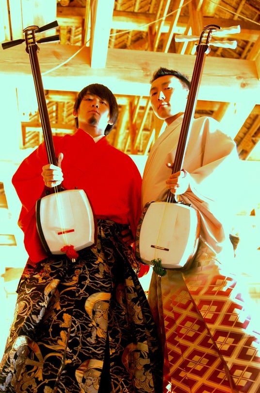 笑えるパフォーマンスに本格的な津軽三味線演奏を加えた独特のステージを披露。