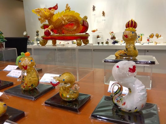 クリスマス、来年の干支・巳、正月のモチーフを色彩豊かなガラスで表現した約50点を展示。