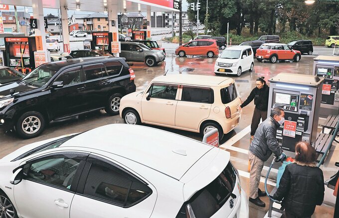 政府の補助金減額でガソリンや灯油などの燃油価格が19日以降に値上がりする見通しから、富山県内のガソリンスタンド(GS)には18日、駆け込みで給油する客が列をつくった。物価高騰の中で追い打ちとなる値上げに、客からは「車やストーブは使わざるを得ず、使用量も減らせない」「家計は苦しくなるばかり」といった声が聞かれた。