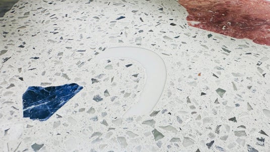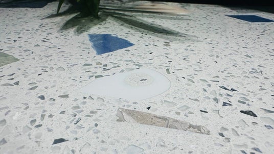 使用用途のない大理石や陶磁器片が練り込まれ、アップサイクルが全面に出たテラゾーベンチ。中央には九谷焼の皿の底が出現している