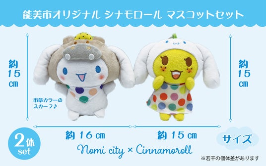能美市オリジナル「シナモロール」と能美市公式キャラクター「ゆず美ん」のマスコットセットをふるさと納税返礼品に追加しました。能美市章の3色(オレンジ、青、緑)の水玉模様入りのスカーフを巻いたオリジナル「シナモロール」です。能美市公式キャラクター「ひぽ能ん」をモチーフにした被り物がキュートなデザインです♪