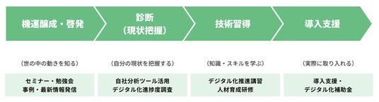 長野県が新たな総合5か年計画で設定した「新時代創造プロジェクト」のひとつとして取り組む「デジタル化一貫支援体制整備」事業は、デジタル技術に関心はあるが、活用に踏み出せていない企業に対して、デジタル技術の基礎情報の提供や企業のデジタル技術活用における課題の見える化を支援します。また、各種産業支援機関と連携して、デジタル技術の導入まで一貫した支援体制も整備します。この度開設したプラットフォームは、デジタルソリューションの一覧や県内企業の活用事例の紹介、およびデジタル化を具体的に進めるために各種産業支援機関とのマッチングを実現し、企業のデジタル化・DX化の一貫支援体制を提供するものです。