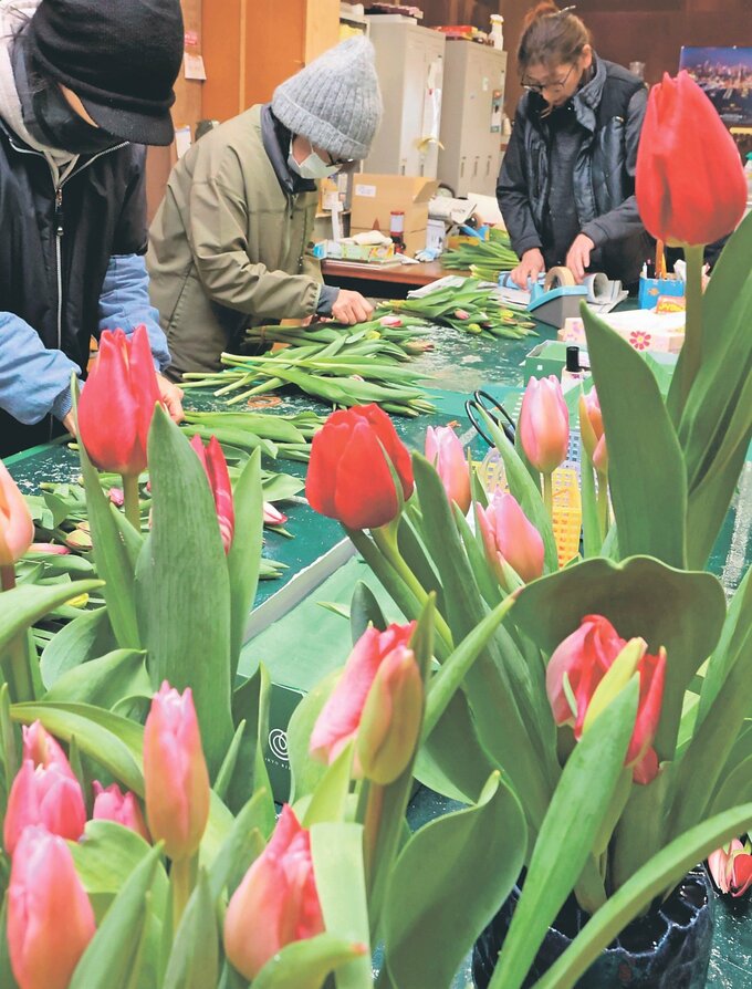 開花前のチューリップを束にして包装し、箱詰めする。19日は従業員が約60箱準備した。3月中旬までに約12万本を出荷する見込み。