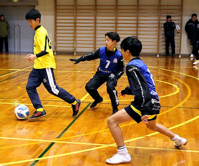 2部では16人が参加。パス練習で、親指の付け根でボールの上部に触るようにトラップすることを教わった。攻守を切り替えながらゴールを狙う実戦形式の練習もあった。