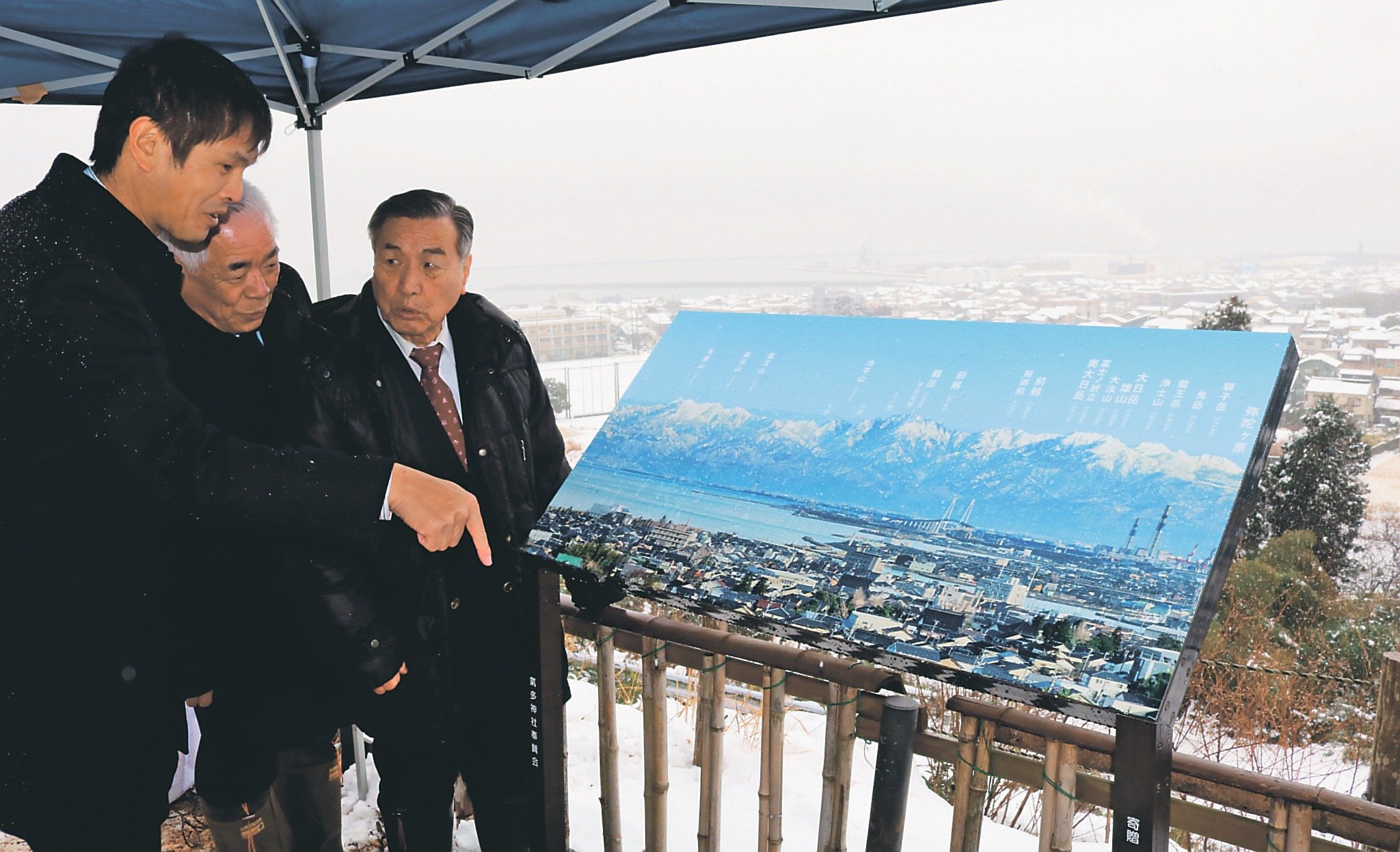 富山県高岡市伏木一宮の氣多(けた)神社奉賛会(北野健一会長)は、境内の展望台「氣多の杜(もり) 高志のみはらし」から見える美しい風景を発信しようと、同所に景観を紹介する看板を設置した。23日に除幕式が開かれた。