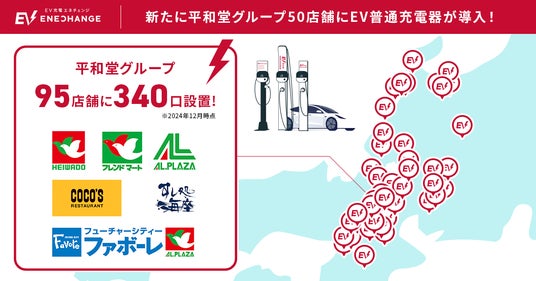 ENECHANGE(エネチェンジ)株式会社(本社:東京都中央区、代表取締役CEO:丸岡 智也)は、株式会社平和堂(本社:滋賀県彦根市、代表取締役社⾧執行役員CEO:平松正嗣、以下:平和堂)の39店舗に加え、グループ会社である株式会社ファイブスター(本社:滋賀県彦根市、代表取締役社長:西川好人)の飲食店10店舗、同じくグループ会社である富山フューチャー開発株式会社(本社:富山県富山市、代表取締役社長:小杉茂樹)の商業施設1施設に合わせて209口の6kWの普通充電器「EV充電エネチェンジ」を追加設置し、順次運用を開始いたしますことをお知らせします。これにより昨年の設置と合わせて*1 平和堂グループ95施設に340口の設置となりました。