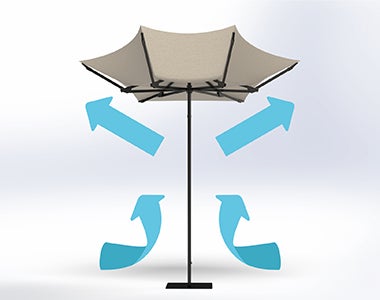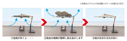 強風時は風抜き機構が自動開閉し、パラソルの店頭・破損を防止します