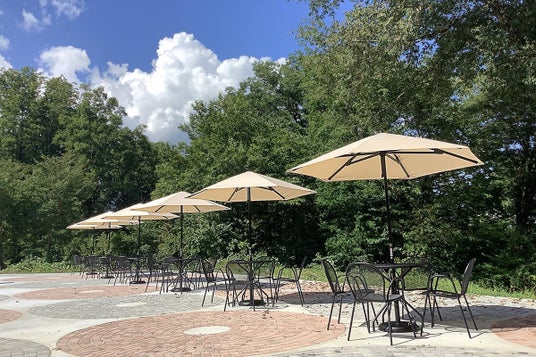 ◆開かれたコミュニケーションの空間を提供する日除け付き屋外用テーブル