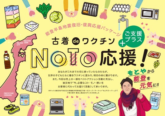 日本リユースシステム株式会社(本社:東京都港区、代表取締役:山田 正人)は、2024年12月24日(火)「古着deワクチン 能登半島地震復旧・復興応援パッケージご支援プラス 11,000円(税込)」の販売を開始しました。