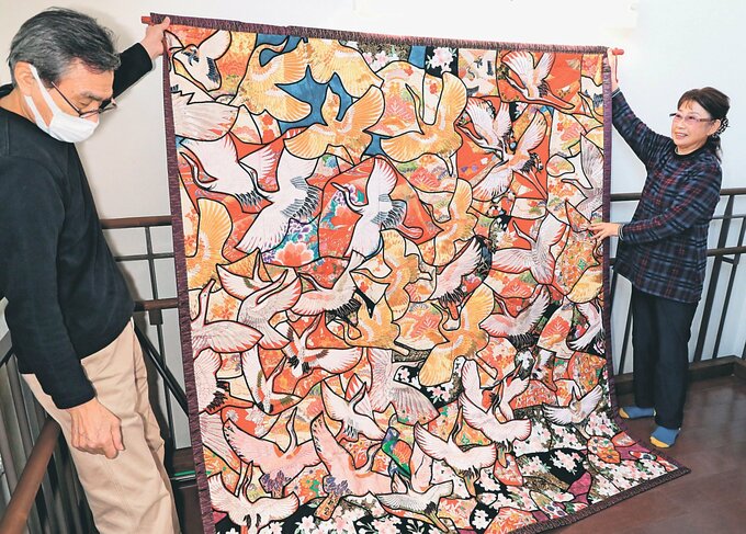 施設内2カ所に自作のキルトを飾り、定期的に掛け替えている。「飛んで-」(縦213センチ、横200センチ)は打ち掛けに入っているツルを見て着想した。約30枚の打ち掛けから切り抜いて縫い込み、1カ月半ほどで仕上げた。華やかな雰囲気になるよう桜などもあしらった。