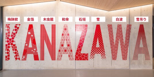 加賀藩主前田家の家紋「梅鉢紋」、日本一の生産量を誇る「金箔」、 金沢の町家の特徴「木虫籠(きむすこ)」、和の伝統を感じる「和傘」、石垣の博物館と言われる金沢城「石垣」、北陸の冬を象徴する「雪」、 日本海の「白波」、金沢の冬の風物詩「雪吊り」。