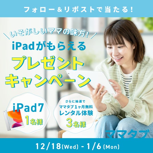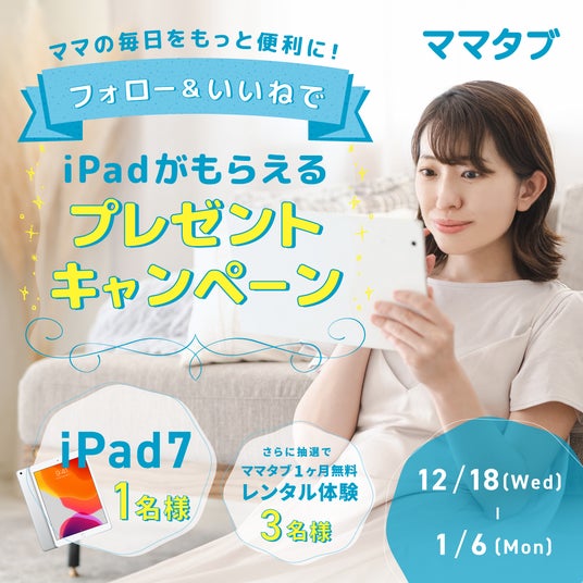 サブスクiPadレンタルサービス「ママタブ」開始を記念して、ニューズドテックの公式SNS(X、Instagram)にて、公式アカウントをフォロー&リツイート、フォロー&いいねで、iPad7が1名に当たるキャンペーンも同時開催中です。期間は12月18日から2025年1月6日まで開催しています。