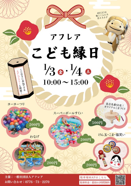 令和7年1月3日・4日、「アフレアこども縁日」が開催されます。お正月の特別なひとときを、昔ながらのお正月遊びや縁日ならではの楽しい遊びで楽しんでみませんか。笑顔が広がる新年のスタートを、ぜひアフレアでお迎えください。