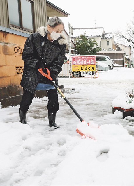 28日の富山県内は冬型の気圧配置が強まり雪が降った。富山地方気象台によると、午後9時の積雪は富山9センチ、高岡(伏木)4センチ。富山市長柄町では、住民が自宅前の除雪作業に追われた。