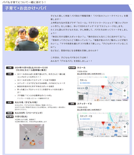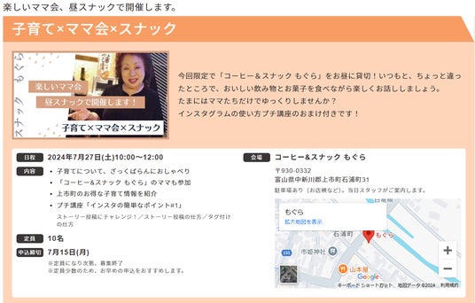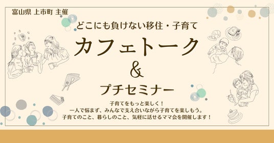 本事業の目的は、上市町のどこにも負けない移住・子育て施策をより多くの方に知ってもらうことです。そのために、上市町のホットスポットでカフェトークを開催し、様々なテーマで町内外の方や移住者、子育て世代の方の声を聞き、参加者同士での意見交換や情報交換を行いました。上市町からの移住・子育て支援情報のお知らせも行い、その様子をSNSを通して発信することで、多くの方に上市町の住みやすさ、子育てのしやすさを知っていただく機会としています。