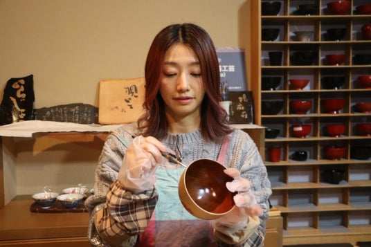 山中温泉の伝統工芸といえば≪山中漆器≫。【うるしの器あさだ】で≪漆絵付け体験≫をすることに!すらすら筆が進む三田村。どのようなものができたのでしょうか。