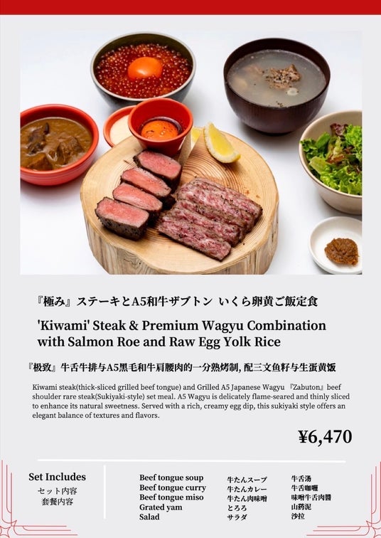 このメニューは、「牛たんの檸檬」の1号店である「新宿焼肉 牛たんの檸檬 総本店」で大人気の“厚切り牛たんステーキとA5黒毛和牛のザブトン(スキヤキ風)”を一度に楽しめる贅沢な定食で、このたび浅草店でも本格的に提供を開始いたします。