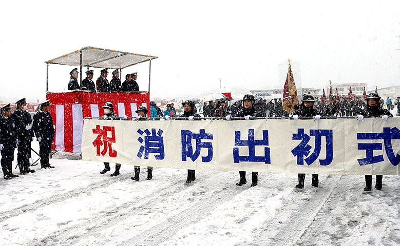 富山県射水市は4日、同市海王町(新湊)の海王丸パークで消防出初め式を行った。2024年は能登半島地震の影響で中止となったため、2年ぶりの実施。雪の降りしきる中、消防団員や消防署員ら300人余りが防火防災に向けて気持ちを新たにした。