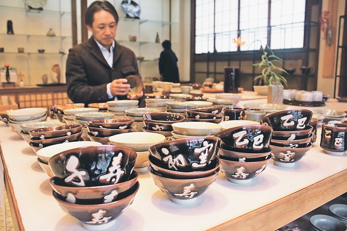 富山県立山町上末の越中瀬戸焼「千寿窯」で4日、えとの文字が入った初窯飯わんの販売が始まった。新春恒例の企画で、愛好者らが買い求めた。