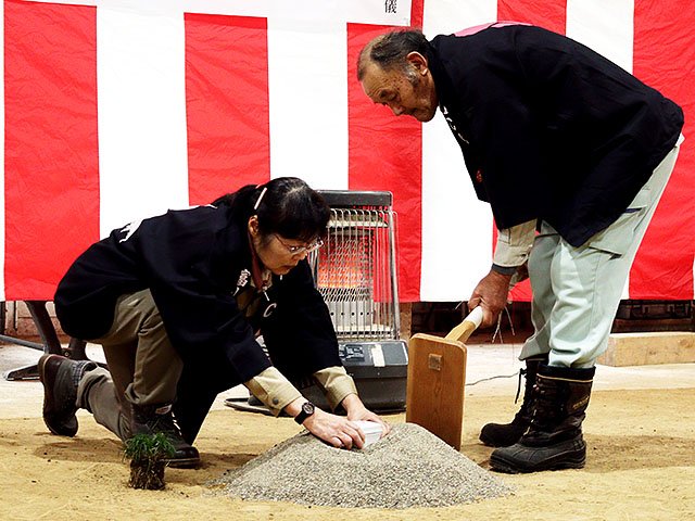 上野幸夫学院長が祭主を務め、祝詞を奏上。環境職藝科の教員と学生は、鎌で草を刈り取って聖地とし鎮物(しずめもの)を埋める「苅初(かりそ)め鎮物の儀」、建築職藝科の教員と学生は、三つの大工道具を「水」の字の形に並べて置く「道具奉納の儀」などを行い安全を祈願した。